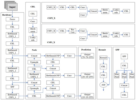 YOLOv5s has a high speed of detection and accuracy, and its model is tiny [21]. The smaller the network model, the lower the performance requirements for mobile and the easier it is to deploy [22]. Therefore, for the consideration of the weight file size, recognition accuracy, and detection speed of the network model, this paper selects YOLOv5s, which has the fastest detection speed and relatively high recognition accuracy for the study. The YOLOv5s network structure can be divided into four parts: Input, Backbone, Neck, and Prediction, and its network structure is shown in Figure 3.