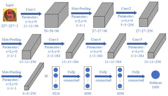 AlexNet was designed by Alex Krizhevsky et al. [28] and was the winner of the ImageNet large-scale visual recognition 2012 competition. AlexNet is a type of convolutional neural network which is now widely used in machine learning fields such as image recognition [29]. Its network model is shown in Figure 4.