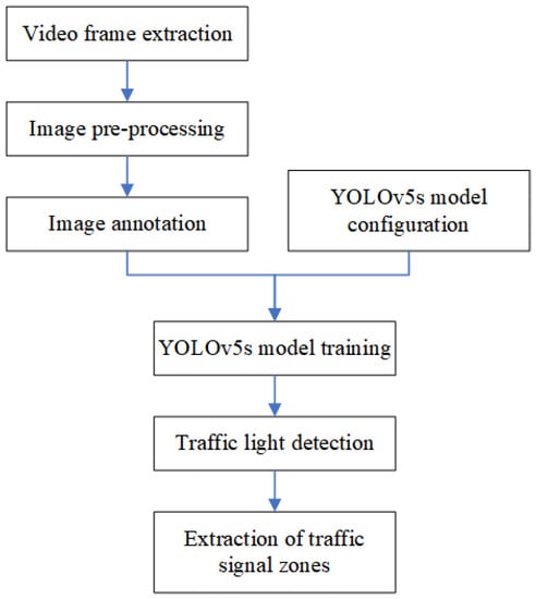 Traffic light detection mainly includes video frame extraction, image preprocessing, and image annotation, as well as YOLOv5s-based model training and target detection. The specific process is shown in Figure 5.