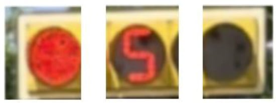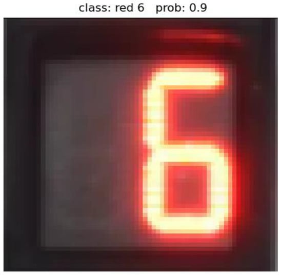 Figure 18 and Figure 19 show pictures of the same set of traffic signals. The validation result obtained by the recognition network model in Figure 18 is “left red,” with a confidence level of 91.5%. The validation result in Figure 19 is “red 6,” with a 90% confidence level. By combining the verification results, the complete information about the group of traffic signals “red left, red 6” can be obtained. The specific meaning is 6 s countdown to the left turn red signal. The validation results show that the network model can identify both arrow signals and countdown signals with high accuracy.