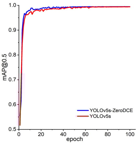 From the figure, we can see that the mAP of the model after performing the low-light enhancement algorithm is generally better than that of the original network model. The final mAP can reach 99.46%, which is an improvement of 0.07% compared with the original model. Therefore, when there are a large number of low-light images in the dataset, a reasonable low-light enhancement algorithm can improve the performance of the network model to a certain extent.