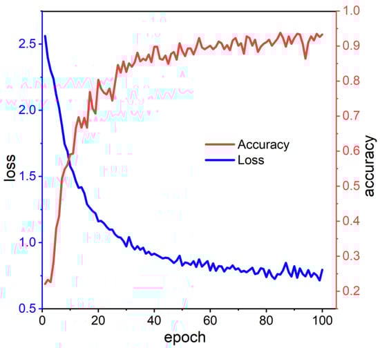 Analysis of Figure 17 shows that as the epoch increases, the loss value gradually decreases, while the accuracy rate gradually increases until 93.3% and stabilizes. As the loss value decreases, the accuracy can remain around the maximum value, meaning that the network is becoming better at distinguishing between categories even if the final prediction remains the same.