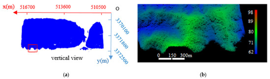 A typical sea area in Longkou City, Shandong Province, China, was selected as the experimental object. The data size is 165 MB with a total of 5,922,266 points. The lower left coordinate is x = 516,728, y = 3,372,488.2, z = 89.639999; the upper right coordinate is x = 510,528.21, y = 3,370,108.7, z = 72.589996. These coordinates are coordinates under the space rectangular coordinate system. The coordinate origin of the space rectangular coordinate system is located at the center of the reference ellipsoid, the Z-axis points to the north pole of the reference ellipsoid, the X-axis points to the intersection of the starting meridian plane and the equator, and the Y-axis is located on the equator plane and forms a 90° on the X-axis with the right hand system. Each point contains three-dimensional coordinate information, echo intensity, and echo times information. The original image is shown in Figure 1a, in which the red box shows the coastal zone area composed of a larger cliff area. The size of this cliff area data file is 11.196 MB, with a total of 405,650 points. The point cloud image is shown in Figure 1b.