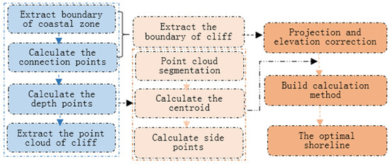 The main process is now discussed. First, the boundary of the point cloud toward the sea in the cliff area was extracted. Then, the connection points between the cliff and ordinary segments were extracted using the designed method, and the depth points were calculated. Finally, the point cloud of the cliff area was accurately extracted. Using the point cloud of each block in the cliff according to the x-coordinate, the centroid of the point cloud in each block was calculated, followed by the coordinates of the side points on both sides of the block derived from the centroid coordinates. The side points were then projected onto the water surface, and the elevation was corrected. Subsequently, the boundary of the cliff section was projected onto the water surface. The optimal coastline at the cliff according to the two projected point clouds was calculated using the proposed method. The general process is illustrated in Figure 2.
