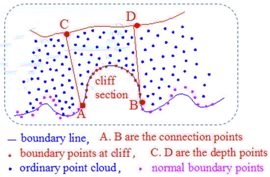 For the coastal zone data form, as shown in Figure 1b, the boundary point cloud dataset was obtained using the extraction method, provided in the literature [5], in which edge points were extracted based on the distribution rule of acquired data during airborne lidar scanning. The distribution rule is roughly as follows: the x or y coordinates of the points will change from small to large, then from large to small, and then from small to large with the scanning line. The point cloud dataset of the boundary was set as , which contains both the boundary points of the normal coastal zone and those near the sea at the cliff. There were two special transition points at the intersection of these two types of boundary point clouds, points A and B (Figure 3). These two points connect the boundary point set of the normal coastal zone to the edge point set of the cliff, and then again to the boundary point set of the normal coastal zone. For the boundary point cloud of the normal coastal zone, the elevation difference between two adjacent points was relatively small, and the maximum elevation difference was approximately 10 cm. As such, when point A was reached, the elevation of the point next to A was much higher than that of point A, and then the elevation of the point increased. When the point reached the top, the elevation decreased. Once it was reduced to junction point B, the elevation change of the point was small, and it transited to the boundary point cloud of the normal shoreline. Because the magnitude of the elevation changes of points was not easy to determine, the change ratio of the difference in elevation between the rear and current points, and that between the front and current points, was evident. Therefore, the corresponding judgment rules can be set according to this feature to find points A and B.