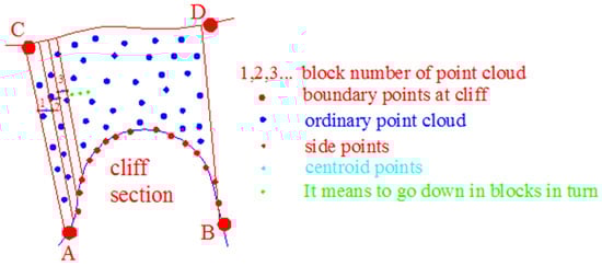 Three concepts are defined here. (1) Connection points. The outer line of the point cloud in the sea area, which includes the cliff section, is the process of passing through the outer line of the normal ground, then passing through the transition point to the outer line of the cliff section, and then passing through the transition point on the other side to return to the outer line of the normal ground. These two transition points, the two points connecting the outer line of the ordinary ground and the outer line of the cliff section, are called “connection points”. (2) Depth points. From the outer line of the cliff section, the ground of the cliff section will be lowered from the water body side to the land side (in this case, the ground of the cliff section will be lowered from the land side to the water body side, which is almost non-existent in practice). When the ground elevation is lowered to approximately the same height as the water body, the ground at this time is considered as the last position of the cliff section. This position can be divided by a line, which is imaginary in the data. However, the ground of the cliff section will decrease from the water body side to the land side; that is, the elevation of the ground will decrease. The ground is lowered to approximately the same height as the water body; that is, the elevation of the ground is close to the elevation of the two connection points. Therefore, the point with the smallest difference between the two connection points in the x, y plane direction and the z elevation direction can be found in the cliff section area data, and these two points are called “depth points”. (3) Side points. The point cloud of the cliff segment is segmented at fixed intervals according to the x-coordinate (x-coordinate when the main coastline is east-west or west-east, and y-coordinate when the main coastline is north-south or south-north). Each segment is called a point-cloud block, and the centroid coordinates of each point-cloud block are calculated. Each block can be imagined as a rectangle. Take the coastline whose main trend is along the x-axis as an example; the short side of the rectangle (that is, the block spacing) is parallel to the x-axis, and the long side is parallel to the y-axis. Only the x and y coordinates of the point cloud in the block are considered. It can be imagined that the plane coordinates of these points are all within the rectangle. Then, the parallel line to the short side of the rectangle is made through the plane coordinates of the centroid point of the block. Then, the line is parallel to the short side and also parallel to the x-axis. The parallel line will have two intersection points with the two long sides of the rectangle. These two intersections are called “side points”.