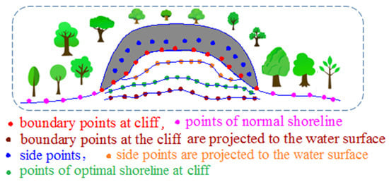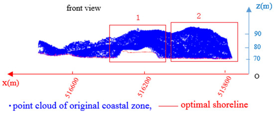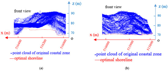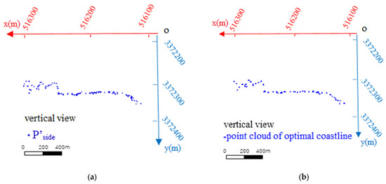 After obtaining the point cloud dataset of the centroid points, the coordinates of the side points of each block were calculated according to the centroid point coordinates and x-coordinates of the two boundaries of each block. The x-and y-coordinates of the side points were constant and projected onto the water surface. The elevation coordinates of each point were corrected according to the elevations of points A and B in the two sections, and the point cloud dataset of the side point projection coordinates was obtained. This point cloud dataset was recorded as , and its diagram is shown in Figure 9a. By combining the point cloud dataset of the outermost coastline at the cliff extracted at the beginning, the projection point cloud of side points, and the generation method of the optimal coastline, the point cloud of the optimal coastline was calculated, as shown in Figure 9b.