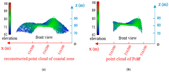 When the value of is close to one, it can be regarded as the boundary point of the normal coastline. For the two connecting points A and B, the value of one point should be larger, usually greater than 2, and that of the other point should be smaller, approaching 0. Therefore, when the value of is greater than 2 or tends toward 0, the point can be extracted, and then the extracted point can be either point A or B in Figure 3. For the extraction of point cloud on the cliff, the intercepted depth H must be determined, which can be obtained by first finding the two points C and D that are the closest to the x coordinates (y coordinates, when the coastline is roughly south-north or north-south) of A and B, and their elevation is also the closest to the elevation of A and B. First, the two points C and D are determined according to strict conditions, the distance between AC and BD is calculated, and then the average of the distances between AC and BD is calculated. This value is the intercepted depth H. With the limitation of the x coordinate interval of points A and B, combined with the depth parameter H, the point cloud of the coastal zone at the cliff can be accurately extracted, assuming that this point cloud dataset is .