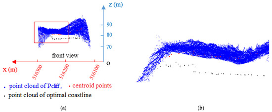 (a) Superposition of point cloud of optimal coastline and centroid and point cloud at cliff; (b) The enlarged view of the red box in Figure (a).
