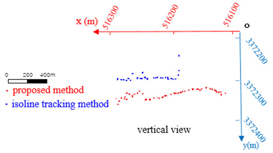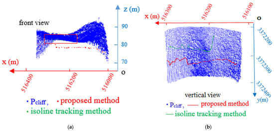 The superimposed display of the coastline point clouds calculated using the proposed method and the isoline tracking method and the point cloud of the cliff segment are presented in Figure 16a. Points in the red box, that is, green points, were calculated with the isoline-tracking method. In the figure, the green points will be projected into the water surface, so the red and green points are approximately in the same plane, and their elevations are close. Figure 16b shows the superposed display of coastlines generated based on the two types of points and point clouds of the cliff section. The green coastline shows a large error and a large deviation from the actual trend, whereas the red coastline is smoother, continuous, and closer to reality.
