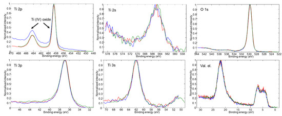 In order to resolve the discrepancy between the supposed (by the color) and observed crystal structure of TiHO samples, we also used the XPS technique and determined the chemical state of titanium. If it were present, Ti(III) oxide (i.e., Ti3+) should have an O 1s peak component at approximately 532.5 eV and Ti 2p peak components at 457.3 eV and 462.5 eV [28,29]. Moreover, looking at the color changes of the TiHO samples, one might expect that peak components related to Ti(III) oxide should become stronger proceeding from sample B1 to sample B3. Notwithstanding the initial assumptions and significantly different appearance of TiHO samples, all photoelectron spectra of titanium, oxygen and valence-band electrons were nearly identical (Figure 2). More specifically, Ti 2p photoelectron spectra for all TiHO samples had two almost fully symmetrical peaks at approximately 458.7 eV and 464.4 eV. These peaks fit well with the standard Ti 2p3/2 and Ti 2p1/2 peak positions of Ti(IV) oxide [28]. Similarly, all acquired O 1s spectra had a strong peak at 530.0 eV with a small shoulder at 531.0–531.5 eV. The main O 1s peak corresponded well with the oxygen from Ti(IV) oxide [28], whereas the higher energy shoulder was attributed to C-O [30] and O-H groups [31] presumably coming from the adventitious surface contamination and moisture.