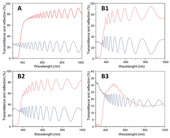 In defected TiO2 and mixed TiO2-Ti2O3 materials, Ti3+ cations introduce new electron levels just bellow the conduction band of TiO2 and result in the strong absorbance (mostly witnessed as a fall in light transmittance) above 500–600 nm [19,21,32]. At the same time, these materials demonstrate an increase in reflectance starting from 400–600 nm (the position of the lower end of reflectance increase depends on the oxygen content [21]). In order to test if as-deposited TiHO films have these optical characteristics of Ti3+ oxides, optical transmittance and reflectance measurements were performed (Figure 3). Typically for standard TiO2 films, above 400 nm, sample A had a stable transmittance level of nearly 80% and reflectance of approximately 20%. Films deposited with low and medium hydrogen concentrations (samples B1 and B2) had slightly lower optical transmittance, but it remained relatively stable over the whole tested range. Sample B3, on the other hand, had a considerably lower transmittance, which peaked out at 500 nm and reached just over 30%. Such transmittance spectra are typical for Ti(III) oxide [22], but there was no rise in reflectance spectra, and this feature distinguished the B3 samples from other reported blue tinted defected TiO2 and/or Ti2O3 films [4,21].