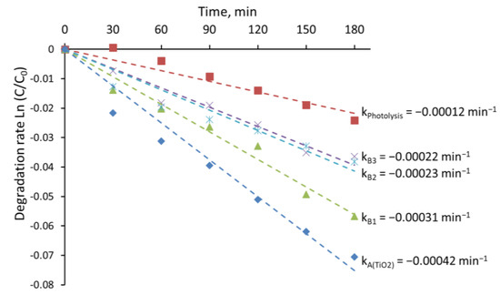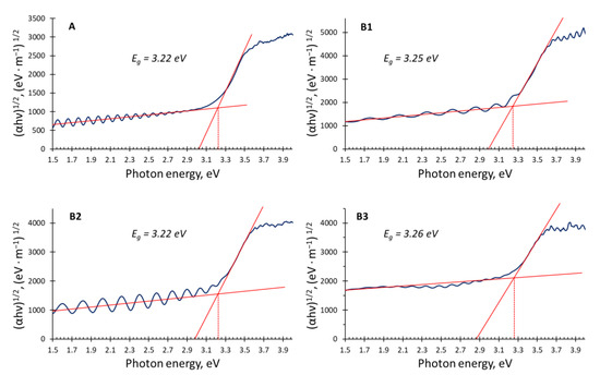 Another interesting characteristic of the current TiHO films is that higher hydrogen content resulted in slightly higher optical band gap values (samples B1 and B3 had band gap values of 3.25 and 3.26 eV, respectively, Figure 4) than that of standard TiO2 (sample A had a band gap of 3.22 eV). Meanwhile, the reported band gap values of reduced or defected TiO2 materials had a tendency to be lower [4]. Additionally, as a common trend, reduced or defected TiO2 oxides have higher photocatalytic activity [27]. However, in the current study, photocatalytic MB bleaching efficiency using tinted TiHO films (samples B2 and B3) was weaker in comparison to that with samples A and B1, which were deposited using lower hydrogen fractions in the gas mixture (Figure 5).