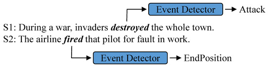 Event Detection (ED) aims to identify trigger words from a given text and classify them into corresponding event types. As shown in Figure 1, an ED model aims to identify destroyed in S1 as an Attack trigger word and fired in S2 as an EndPosition trigger word. As an important task in Natural Language Processing (NLP), ED contributes to Event Argument Extraction [1] and Event–Event Relation Extraction [2,3], and it is beneficial for real-world applications, including Automatic Text Summarization [4], Information Retrieval (IR) [5], and Question Answering (QA) [6].