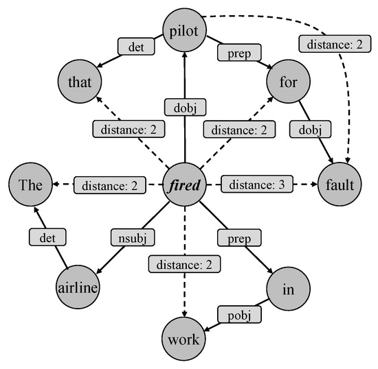 Distance refers to the syntactic distance (least hops) between two words (nodes) in the syntactic dependency graph. As shown in Figure 5, the solid line and dashed line represent 1-order distance and multi-order distance, respectively.