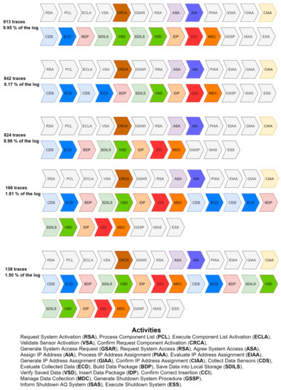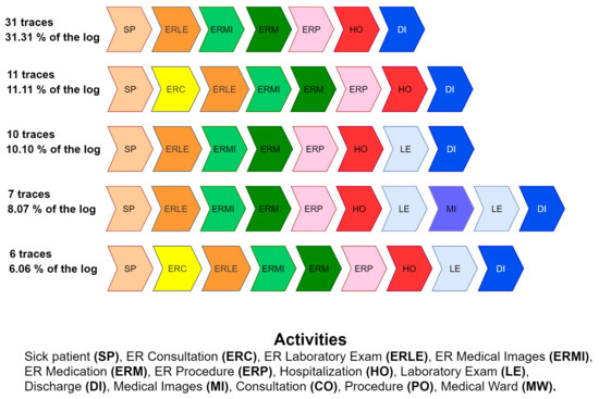 Figure 9 shows the main variants retrieved from the event log of the patient’s treatment process. The analysis of process variants tries to identify the differences in the traces representing the execution of the process derived from the same business process [40,41]. In the third map of the process variants, it is observed that the sequence of HO-LE activities is only executed once. However, in the discovered process diagrams, it is identified that the LE activity is of the loop type; because this behavior is infrequent, it is not represented within the main variants of the process. In the fourth variant (from top to bottom) presented in Figure 9, the sequence of LE-MI activities was executed with a return to the LE activity on continuous occasions, before and after the execution of the MI activity, which allows identifying a loop in this part of the process flow.