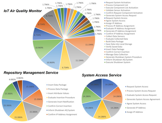 Finally, the values achieved in the quality metrics of the business process models discovered are shown in Table 4. In the precision (Equation (3)) and recall (Equation (4)) metrics, the maximum value of 1.0 is obtained in the business process models of the three participants. On the one hand, the precision metric value indicates that each discovered model can reproduce all the behaviors within the event log. On the other hand, the value reached in the recall metric indicates that the models do not contain behaviors that are not included in the event log. In the case of the generalization (Equation (5)) metric, the evaluated process models reached the values of 0.991, 0.993, and 0.980 for the IoT Air Quality Monitor, Repository Management Service, and System Access Service participants, respectively. The value of the generalization metric indicates that the process flow and the behaviors it can reproduce are frequently used.
