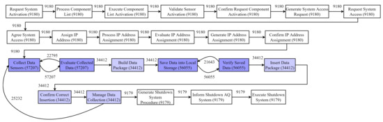 The discovery of the business process model is one of the core tasks in process mining. Therefore, in our proposed approach, the Split-miner [26] and DFG [39] algorithms were applied to discover the business process model for each participant, allowing us to compare and verify the completeness of the event logs generated. The DFG algorithm was implemented using the PM4PY tool. In Figure 5, the graph discovered from the IoT Air Quality Monitor event log using the DFG algorithm is shown (see Definition 5). This graph is composed of 24 activities. The highlighted activities represent the behavior in the business process of collecting data through the sensors. Moreover, several cycles are observed between the “collect data sensors” and “evaluate collected data” activities, as well as in the “save data in local storage” and “verify saved data” activities. In addition, there is a return immediately from the “manage data collection” to “collect data sensors” tasks. In Figure 6, the discovered business process model based on the BPMN language (see Definition 4) using the Split-miner algorithm [26] is shown. In the first part of the discovered process, a flat behavior is observed, only a sequence of activities. This sequence is because no gateways were detected in the event log that determines a path division or a loop in the process’s behavior. The business process models discovered by the two algorithms coincide in their flow and behavior. The above guarantees that the built event log can be interpreted by process mining tools, validating that the structure of the event log is correct.