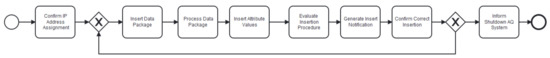 Figure 7 shows the process model discovered from the event log built for the Repository Management Service participant using the DFG algorithm. In the discovered business process flow, some tasks are identified that relate to the tasks contained in the discovered process model for the IoT Air Quality Monitor participant, which is correct because these participants exchange messages to execute the collaborative business process. This behavior defines a cycle of execution of the activities with a path division element that determines a return to the “Insert Data Package”, allowing execution to be restarted for the storage management of the values collected by the sensors of the air quality monitoring system. Figure 8 shows the BPMN process model discovered for the same participant using the split-miner algorithm. The models discovered by the two algorithms agree on the flow and behavior of the business process.