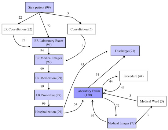 Figure 10 shows the graph discovered using the DFG algorithm from the event log built from the process identified for the patient treatment with pneumonia symptoms. At the beginning of the business process, three paths are distinguished to start the treatment and hospitalization of the patient. After admission to the hospital, several cycles related to the laboratory exam activity are recognized; for example, between the activities laboratory exam and medical images, as well as between the activities laboratory exam and procedure. Likewise, a low-frequency sequence is distinguished in the process flow between laboratory exams, medical images, medical ward activities, and returning to the laboratory exam activity before the patient’s possible discharge. In addition, several tasks have loop-like behavior in the generated event log but are discarded by the DFG algorithm due to their low frequency in the event log traces.