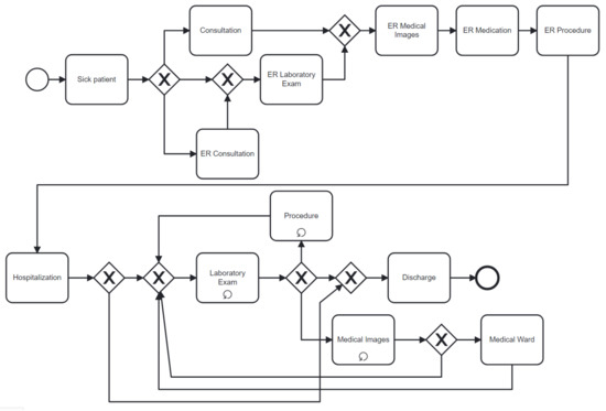 Figure 11 shows the business process model based on the BPMN language, which was discovered using the split-miner algorithm. The business process flow discovered by the two algorithms is consistent in its behavior, tasks, and identified decision points. However, the split-miner algorithm distinguishes several loop-type tasks (Laboratory Exam, Medical Imagesm and Procedure) in the event log traces.