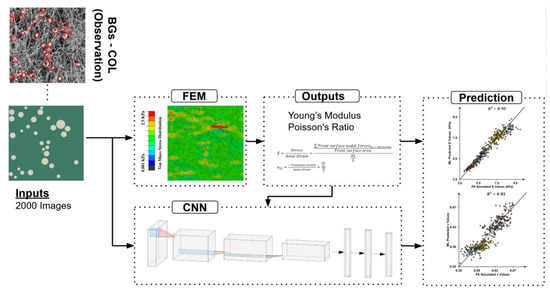 The overall workflow of our framework that integrates FE analysis with the CNN model to predict composite material properties is illustrated in Figure 1. Based on observing the microstructural images of BG-COL composite, we first generated 2000 virtual microstructural images of BG-COL with various structures consisting of circular shapes of BG. The microstructural images of BG-COL were then imported into the simulation software, Abaqus/Explicit software version 2019 (Dassault Systems Simulia Corporation, Providence, RI, USA). Then, their effective mechanical properties were extracted by using python script. The data acted as the foundation for developing our DNN prediction approach. Then, by training a CNN regression network, the mechanical properties of the composite were predicted.