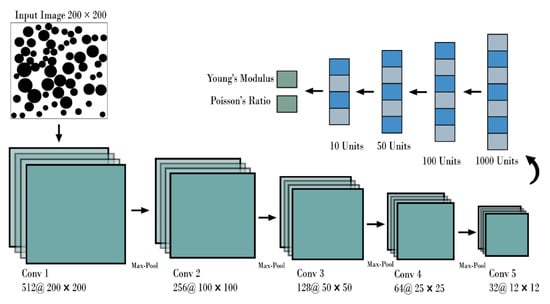 The FE input (imaging) and outputs (Young’s modulus and Poisson’s ratio) are used to train the ML models and then predict the FE outputs in 400 test cases. A sufficiently large number of BG-COL images were generated to represent various composite configurations based on our experimental observations. Specifically, we effectively developed a framework to generate geometries, solve the FE computations, and then create a substantial database of input–output pairs. Similarly, Ford et al. [22] used three common two-phase materials (UD-CRTS [36], UHP mortar [37,38], and MPR paste [39]), including fibers of circular shape with the same diameter, but they used different fiber Vf, median sizes, and particles in a robust cementitious matrix and a metallic particulate-reinforced (MPR) cement mortar. They used artificial neural network (ANN) and forest ensemble MLs methods to predict Young’s modulus and Poisson’s ratio of materials by using geometrical features of particles and Vf inputs. CNN regression was chosen in this work considering that our dataset is 200 × 200 gray images with corresponding mechanical properties.