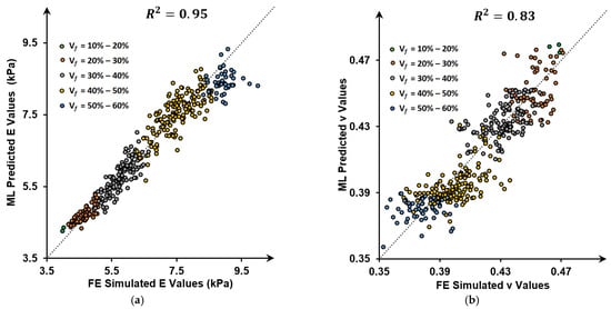 The Young’s modulus and Poisson’s ratio of the test set predicted by the CNN plotted against those obtained by the FE simulation are shown in Figure 4. It is clear that our network can efficiently learn and map the microstructure images to the mechanical properties. Additionally, these results indicate that our model works well for testing images. The ranges of Vf were illustrated in different colors to estimate the influence of BG on the mechanical properties. Results demonstrated that Young’s modulus will increase with a larger Vf of BG. In contrast, Poisson’s ratio decreased with a larger Vf. The MSE for Young’s modulus is 0.135, and Poisson’s ratio is 0.000162. The R-squared for Young’s modulus is 0.95, and Poisson’s ratio is 0.83, which shows how well our model fits. Our prediction is similar to the accuracy by Ye et al. [20].