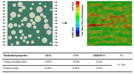 From all 400 testing cases, two representative cases were further delineated regarding the prediction error in Young’s modulus and Poisson’s ratio. The case in Figure 5a with a Vf of 27.73% illustrated that the prediction error of Young’s modulus and Poisson’s ratio is 0.32% and 3.61%, respectively. Moreover, the case in Figure 5b with a larger Vf of 47.85% showed that the prediction error of Young’s modulus and Poisson’s ratio is 1% and 1.7%, respectively. Additionally, the von Mises stress (kPa) distribution in the BG-COL composite demonstrated that the stress concentrations are generally around BG, with the maximum stress magnitude as 3.952 kPa for the case with the Vf of 27.73%, and increased to 11.28 kPa for the case with a larger Vf of 47.85%.