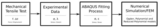 The experimental data of the last tension cycle (7th cycle, ) were fitted to nonlinear constitutive models using the inbuilt nonlinear fitting capabilities available in ABAQUS software package. The hyperelastic models considered for this approach were Ogden (Equation (1)) [27,28], Polynomial model (Equation (2)) [29,30] and finally Reduced Polynomial (RP) model (Equation (3)) [31].