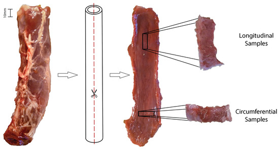 A total of three urethrae from male pigs were used for the mechanical experimental protocol. Following the procedure used by Masri et al. [26], rectangular samples (length: 34.5 mm; width: 10 mm; thickness: ≈2.5 mm) were cut from the urethrae specimens along the circumferential and the longitudinal directions. Figure 3 presents a scheme showing the geometric details of the samples and the sample collection sites in relation to the original organ.