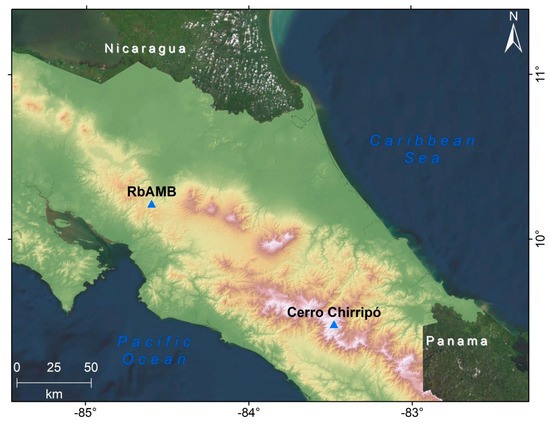 Location map of the study sites: Cerro Chirripó in south-east Costa Rica in the Talamanca Range and RbAMB (Reserva Biológica Alberto Manuel Brenes) in the north-west of the country in the Central Volcanic Range.