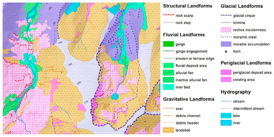 The legend is one of the most important parts of a map, because it allows the identification of the geomorphological characteristics of the study area. The legend for a geomorphological map of a high mountain environment usually needs more symbols than for other areas [49]. One of the most used legends since the 1960s is the ITC Geomorphological System [50]. More recently, at the end of the 1980s a well-extended legend was the one from the Institute of Geography of the University of Lausanne (IGUL). The symbology and legend were designed by Schoeneich [51] at the end of the 1980s, and is used by many European legend schemes; it was created for a 1:10,000 scale, but it can be used on scales from 1:5000 to 25,000 [52]. As usual, in a geomorphological legend, there are standard categories for the geomorphic groups, such as gravitational, structural, weathering, fluvial, volcanic, glacial, periglacial, lacustrine landforms, and hydrography (Figure 2). Depending on the map, the legend will vary, according to the represented elements and the map theme. Some maps represent the landforms by using small variations of the most used legends, others create their own symbols or even maintain the original traces of the cartography (if it has been drawn by hand), thus giving the map a more artistic effect (Figure 3).