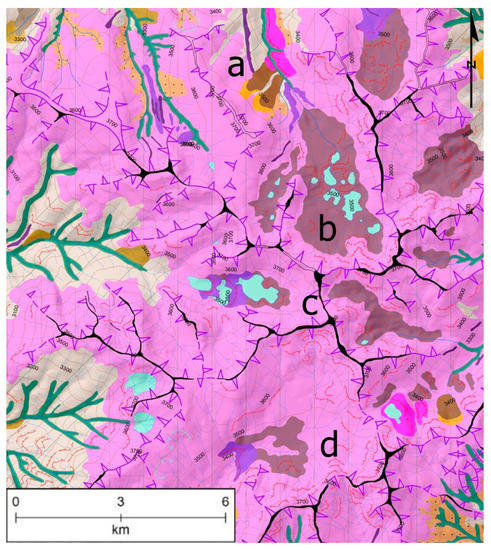 There are also different sequences of glacial lakes entrenched in large till deposits because of the glacier advances throughout the LGM (b in Figure 4 and Figure 5). A series of lateral moraines are preserved in the national park defining the LGM expansion (a in Figure 4 and Figure 5; [6]). Other summits are encircled by volcanic slopes shaped by periglacial dynamics and strongly degraded glacial cirques. Periglacial dynamics such as nivation, frost action, frozen ground, weathering, and mass movement have shaped them (d in Figure 4 and Figure 5). At present, there are not any alpine glaciers, but some landforms remain, and they are protected by a national park [70].