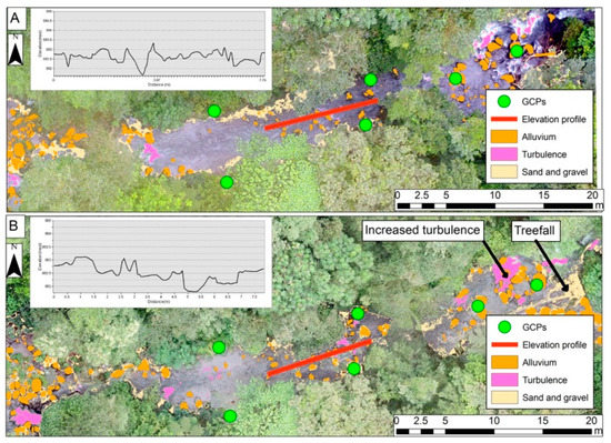 Monitoring high-resolution changes in the San Lorencito River. The analysis of both surveys allowed the detection of slight and detailed channel changes; the elevation profile shows how several boulders have been transported during the observation period. (A) first observation 14 8 2017 and (B) second observation 21 September 2017.
