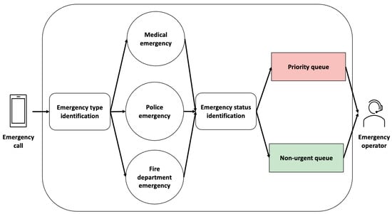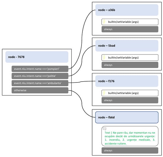 Moreover, in Figure 2, we show the business logic of the chatbot/IVR solution; it contains two components. The first one is a multi-layer module that identifies the emergency type, namely whether it is a police-related, medical, or fire department emergency. Based on beneficiary requirements, all emergency categories were divided into multiple subcategories, thus resulting in a multi-layer approach. The second component identifies whether the situation is urgent or non-urgent. In both cases, the call is handled by an emergency operator.
