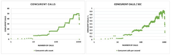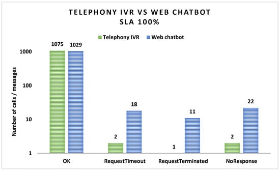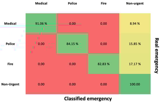 In terms of coverage and availability, we evaluate the IVR solution in laboratory environments, and the results indicate the perfect functionality of the system. Taking into consideration that the proposed solution is designed for the Emergency System, it will use the infrastructure of that system, which complies with the specifications. Moreover, we conduct an empirical investigation using 1015 laboratory experimental calls to the IVR solution, of which 235 are related to medical emergencies, 265 are for the police department, 233 are for the fire department, and 282 are related to non-urgent situations. We analyze the responses of the decision tree and compare them with the expected results, as shown in Figure 11. As observed, the obtained results are compliant with the emergency statuses presented in Table 2. The percent of non-urgent situations detected among medical, police, and fire department situations correlates with the number of non-urgent leafs of the decision tree (1 non-urgent leaf from 6 medical emergencies, 3 non-urgent leafs from 10 police emergencies, and 2 non-urgent leafs from 10 fire department emergencies). Therefore, the experimental evaluation indicates the fact that our approach is able to determine both urgent and non-urgent situations, even though the emergency first came from an urgent branch (medical, police, or fire department). On the other hand, the decision tree proves to be a suitable solution; because of its construction, it does not allow the misunderstanding of emergency types.