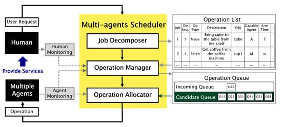 The operation manager is responsible for carefully sequencing the order of operations based on the operation list created by the job composer. The operation manager also reorganizes the order of operations by considering the user requirements. In environments in which multiple agents perform sequential operations simultaneously, it is important to consider the relationships among operations in terms of overall execution. This implies that the scheduler must monitor all executions to avoid possible failures. The order of operations determined by the operation manager affects how agents are utilized. For example, delivering coffee to a person involves two separate and sequential operations: pouring coffee into a cup and delivering the cup full of coffee to the person. Two different agents may be assigned to perform each operation; therefore, to avoid failure to complete the job, it is very important that the second agent does not deliver the cup before the first pours the coffee into the cup.