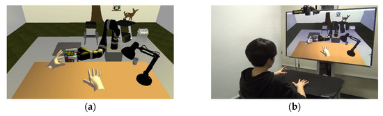 The simulated environment for providing services to a user in a VR smart office is illustrated in Figure 3a. The VR smart office was displayed on a 55-inch flat 3D display with full HD (1920 × 1080). An RGBD camera was mounted on the top to track the user’s hand and show that the user received a service from the agent (Figure 3b).