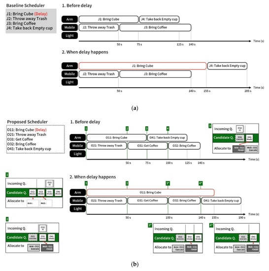 Delay occurs: (a) the baseline scheduler and (b) the proposed scheduler.