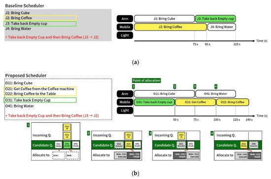 User requests to change the order of service: (a) the baseline scheduler and (b) the proposed scheduler.