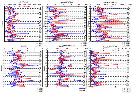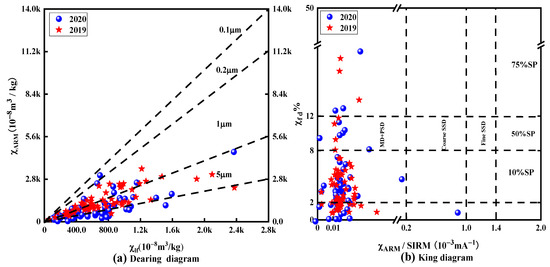 The ratio of the magnetic parameters mainly reflects the grain size of the magnetic minerals. The ratios of χARM/χlf and χARM/SIRM can signify the grain size of magnetic minerals, which decrease with the increase in grain size [27]. χARM/χlf indicates the size of ferromagnetic mineral particles, with higher ratios reflecting more SSD particles and lower ratios indicating more MD or superparamagnetic particles (SP) [26,36]). χARM/SIRM also indicates the particle size variation of magnetic particles, with lower ratios reflecting more PSD and MD particles [37]. The mean values of χARM/χlf are 1.950 in 2019 and 1.437 in 2020. The difference between the χARM/χlf values before and after the COVID-19 outbreak is slight, showing the particle size in 2020 as slightly coarser than that in 2019. In addition, the χARM/χlf values of the dustfall are significantly lower than the background value (3.550) [31], indicating that the grain size of the magnetic particles in the dustfall is significantly coarser. In addition, the mean values of χARM/SIRM are 0.015 × 10−3 m/A in 2019 and 0.222 × 10−3 m/A in 2020, both of which are lower than the background value (0.240 × 10−3 m/A) [31]. In conclusion, the mean values of χARM/χlf and χARM/SIRM of the samples are less than 10 and 0.50 × 10−3 m/A, respectively, indicating that the ferrimagnetic minerals are dominated by PSD and coarser MD grains in the study area.