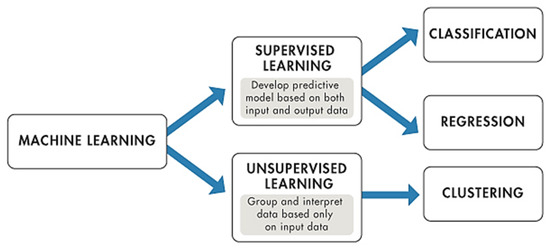 Machine learning (ML) appeared alongside big data technologies and high-performance computing to create new opportunities to discover, analyze, and understand processes behavior. Methodologies of machine learning typically involve a learning process to learn from “experience” (training data) to perform a task. Machine learning (ML) is used to search for patterns in data files (Figure 5). Their models are important mainly for the decision-making process [11,19]. Numerous ML algorithms were developed for various learning pathways, such as supervised, partially supervised, and unsupervised learning. Guided learning (i.e., predictive modeling) is the most widely used approach in the scientific and engineering fields [10,20].