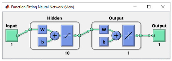 They are among the modern computational methods used for machine learning. They are usually used where the relationships between inputs and outputs are complex and non-linear. The neural network aims to map a set of numeric inputs to a group of numeric results. The acquired knowledge is ultimately applied to predicting output responses from complex systems [25,32]. The next figure represents the scheme of the fitting neural network in the Matlab environment (Figure 6).