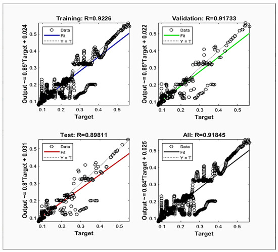 Coefficient of determination (R2) is commonly used to Evaluate (1) the goodness of the linear fit of regression models in ANNs. A value of 1 means that the regression model explains all the predicted variables, which means that the correlation between the two variables is perfect [25].