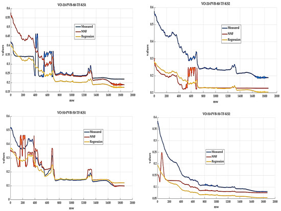 Based on the results of individual qualitative indicators, it can be seen that the model obtained through neural net fitting achieves better results for both test samples, for both states (KS1 and KS2). This is because the model design environment offers more flexibility to influence individual settings. The “overtraining” option also increases the value of the R coefficient by making the model “learn” more. In the RL environment, it is also possible to influence individual coefficients, but only after generating the function and only by manual change. Variations between test samples may be due to the fact that the created models were only applied to the actual sample size—that is, to 1869 values.