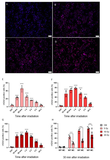 Fluorescence images of cells seeded in MCs, DAPI visualized in blue and γH2AX in red (A–D). γH2AX positive cells in control cells (A) and cells irradiated with 5 Gy (B), 10 Gy (C), and 20 Gy (D) merged with DAPI staining. Time lapse from 10 min to 24 h after irradiation of γH2AX intensity in cells irradiated with 5 Gy (E), 10 Gy (F), and 20 Gy (G). Comparison of γH2AX positive cell count seeded in MCs and 48-well plates after irradiation with 5, 10, and 20 Gy (H). Fluorescence images were acquired with a 10× objective; the white scale bar corresponds to 100 µm. Statistics were performed with one-way ANOVA (E–G) and two-way ANOVA (H) using Bonferroni for post-hoc test. n = 5, *** p < 0.001, **** p < 0.0001.