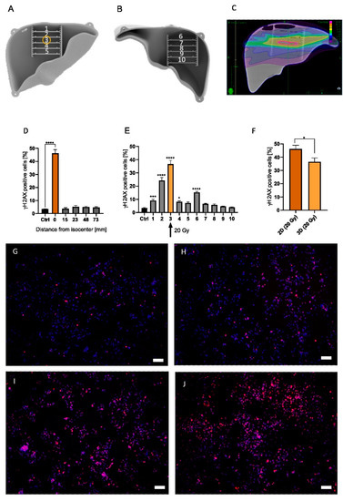 A 3D phantom with MCs #1 to #5 positioned in the anterior half of the liver (A), and MCs #6 to #10 located in the posterior half of the liver (B). Yellow circle indicates target position of the treatment plan (MC #3) (A). Irradiation plan from Monte Carlo simulation from the coronal plane with purple = 0.14 Gy, green = 2.86 Gy, and pink = 20 Gy (C). Measured γH2AX percentage of cells irradiated with 20 Gy in a 2D irradiation setup for 5 MCs with 4 MCs located at varying distances from the isocenter (0/orange bar) (D). Measured γH2AX percentage of cells for MCs #1–#10 in the 3D model irradiated at MC #3 (yellow bar/arrow) with 20 Gy (E). HepG2 cells irradiated in the 2D setup (20 Gy) were compared with cells irradiated in MC #3 in the phantom (20 Gy) (F). Representative images of non-irradiated control (G), MC #1 (H), #2 (I), and #3 (J) are presented with 10× magnification. White scale bar corresponds to 100 µm. Significance was tested with a two-way ANOVA and Bonferroni post hoc test (H,I) and an unpaired t-test (G). To enhance readability, only significance compared to control is shown. n = 5, * p < 0.05, *** p < 0.001, **** p < 0.0001.