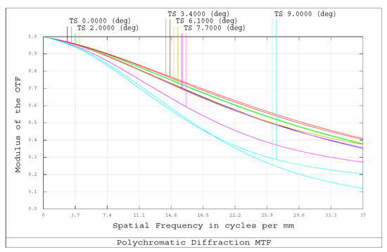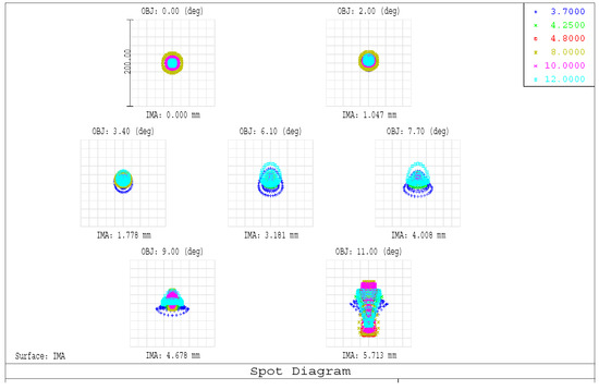 In the actual manufacturing process, the aspheric surface of infrared material can be machined by single point diamond turning. We choose a three-piece structure, in which the first piece of lens material is AMTIR1, the second piece is ZnS, and the third piece is Ge. AMTIR1 is a kind of synthetic material that can transmit light from near-infrared to long-wavelength infrared, and it can achieve very good achromatic effect in the infrared band. The second and sixth surfaces are even-degree aspherical surfaces. The first lens has a large aperture and large off-axis aberration. Aspherical surfaces are introduced on the back surface of the first lens. The fourth and sixth order coefficients are 8.0502 × 10−7 and 1.0185 × 10−9 respectively. Due to achromatic aberration, the third lens has a large power. In order to avoid excessive high-order aberration, an aspheric surface is introduced behind it. The fourth and sixth order coefficients are 3.1083 × 10−6 and −5.128 × 10−12 respectively.