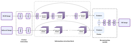 The model is set as a two-line operation on visible light image (RGB) and corresponding infrared image (IR). As shown in Figure 5, it is composed of a feature extraction layer, an information extraction block and a reconstruction block. The feature extraction layer extracts the shallow features of the original low-resolution image and the visible light image by two 3 × 3 convolution operations followed by activation functions. The information extraction block introduces the feature mapping attention mechanism in the RGB line to extract the important feature information from the visible light image and transfer it between channels to supplement the missing information of IR. The dense connection module is introduced in the IR line to extract image features, which can more fully extract IR edge, texture and other information. Finally, the extracted RGB and IR feature information are fused in the reconstruction block, and the global feature information is integrated to complete the IR reconstruction.